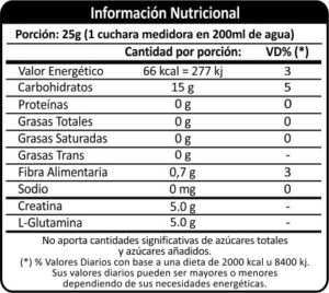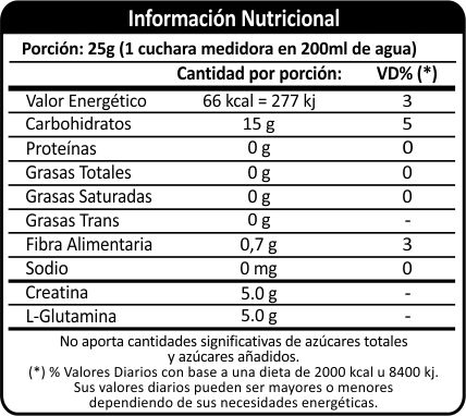 La CREATINA se transforma en energía (fosfocreatina el ATP) dentro del músculo esquelético y es utilizada para la contracción muscular aumentando las reservas de fosfocreatina alta siendo más energía para el músculo, lo que permite mayor resistencia e intensidad durante el ejercicio, junto a la combinación de carbohidratos que aumentan las reservas de glucógeno intra muscular, y la acción de la L-Glutamina que es el aminoácido más abundante en plasma y músculo, catalogado como AA no esencial ya que el organismo humano puede sintetizarlo a partir de otras sustancias en el músculo, esqueleto, pulmón y cerebro principalmente.