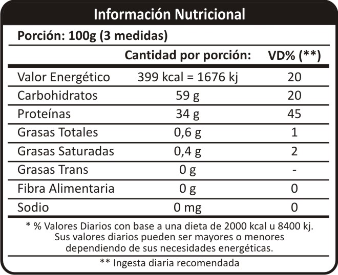 Ingesta recomendada: 100g por día. Una medida (33.3g) por la mañana, una en la tarde y finalmente por la noche, disuelta en agua o leche.
